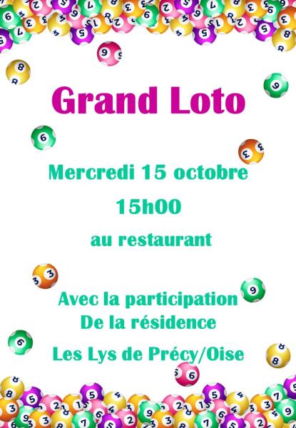 La Fontaine Médicis > Actualités > Grand loto Grand loto Publiée le 09/10/2025 Mercredi 15 octobre à 15h00 nous aurons le plaisir d'accueillir les résidents de Précy/Oise pour un grand loto en salle de restaurant.