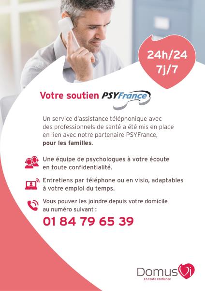 En lien avec notre partenaire PSYFrance une équipe de psychologues est à votre écoute, en toute confidentialité. Ces entretiens peuvent se faire par téléphone ou en visio-conférence et sont adaptables à votre emploi du temps.